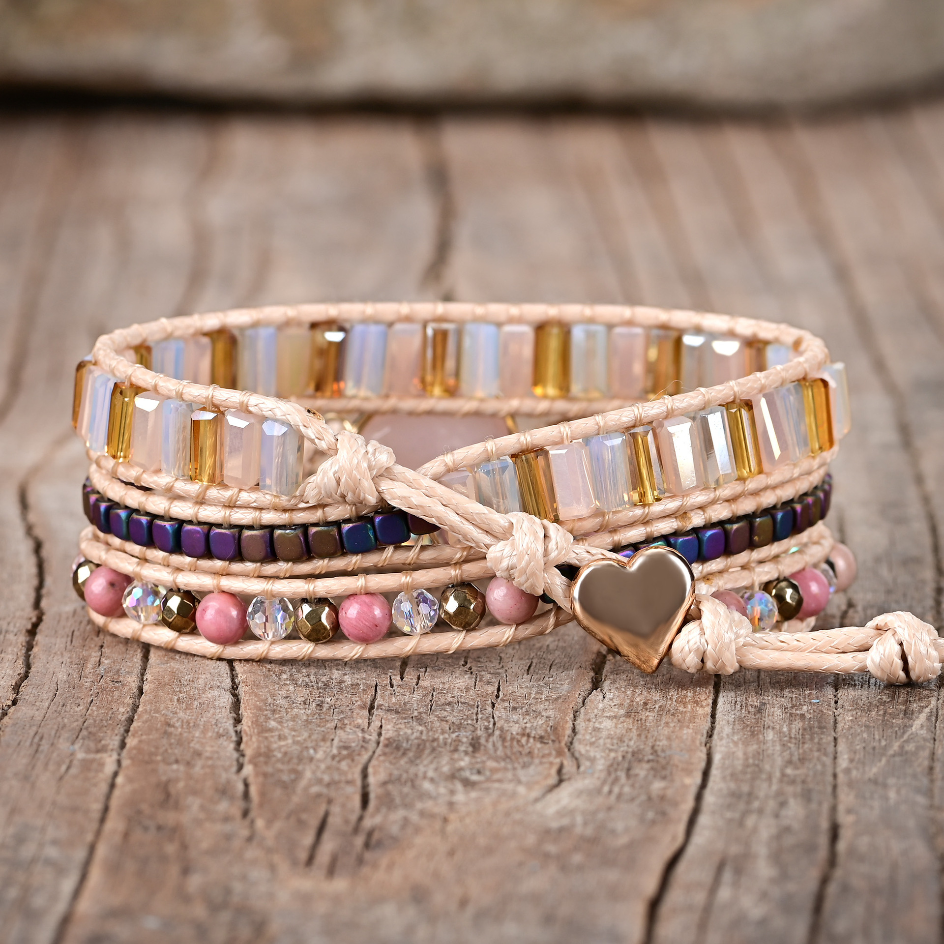 pear-shaped pink quartz hand-woven cowhide woven bracelet three-layer winding bracelet
