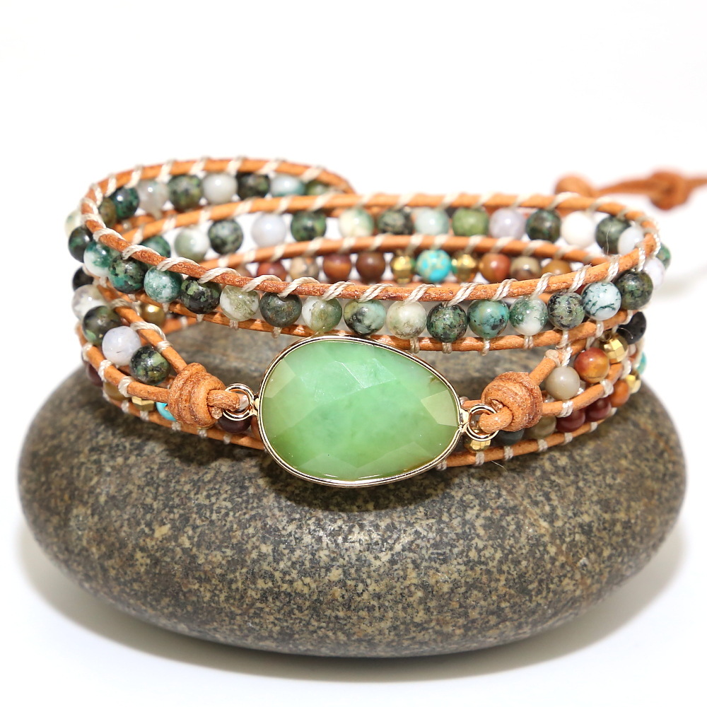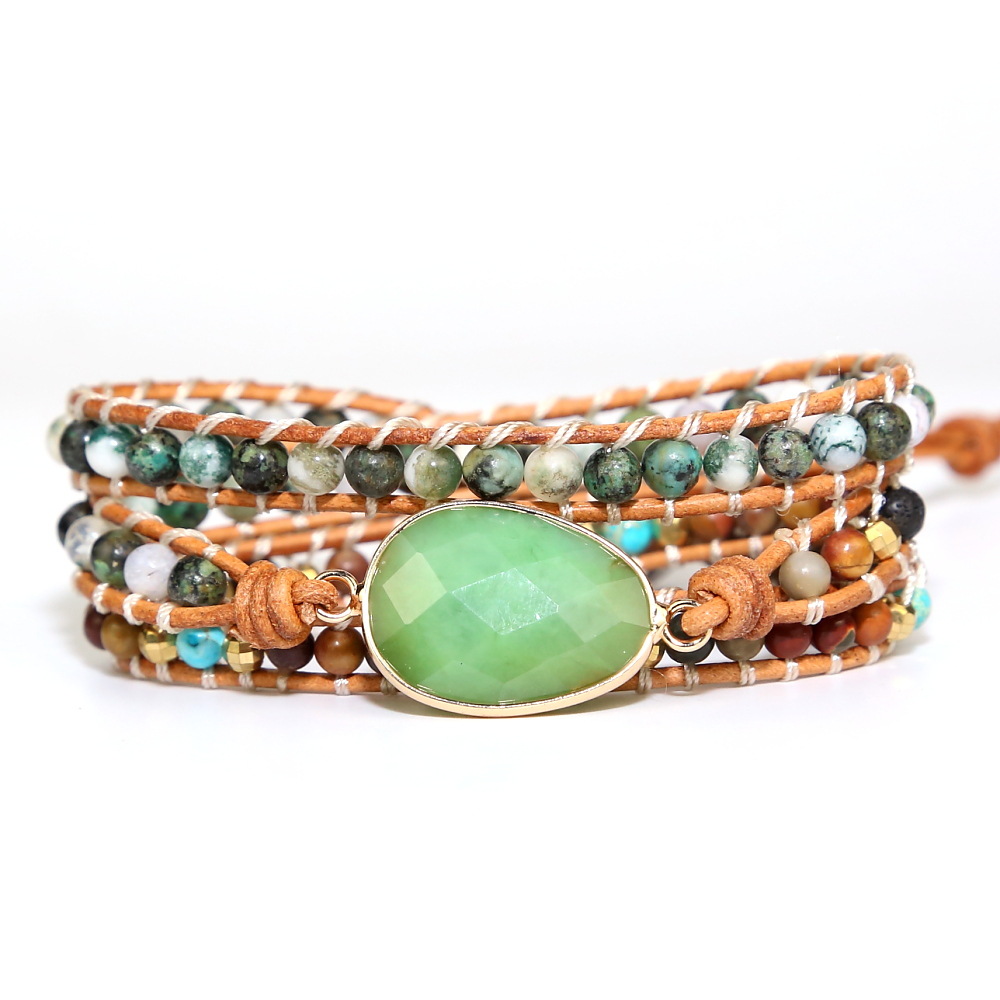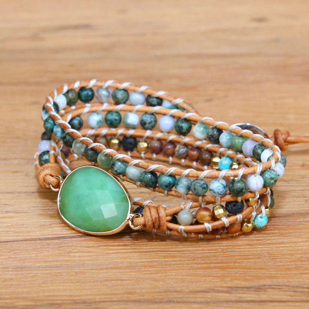 bohemian natural gemstone square cut corner emperor stone 5 strand winding leather bracelet